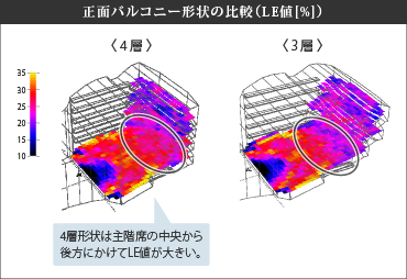 側方反射音の確保のため、正面バルコニーの多層化を検討。3層/4層どちらが最適かコンピューターシミュレーションで分析を行いました。結果、拡がり感の指標値のLE値が4層形状の方が大きな値となることが確認されました。一方で4層形状では、気積が小さく、表面積が増える方向であるため、舞台天井高および客席天井高を十分に確保、同時に上階席のかぶりを可能な限り少なくすることを検討しました。その結果、十分な気積を確保し明瞭でありながら残響感の得られる音場構成を実現しました。