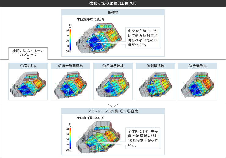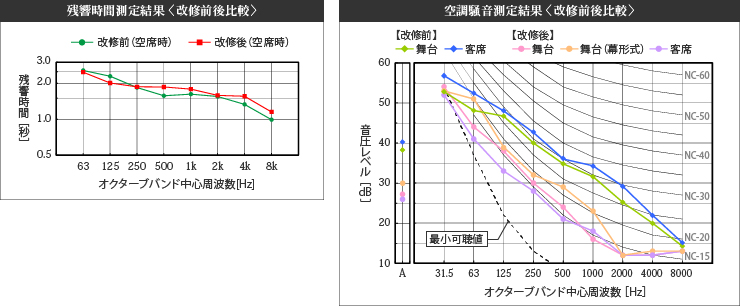 上記のシミュレーション結果をもとに最適な改修を実施し、改修後に音響測定を実施しました。室内音響特性に関しては残響時間が中域で0.2~0.3 秒延び、LE値は客席中央で大きく改善しました。また、騒音特性に関しては改修前のNC-30~35 に対して、NC-20~25と改善しました。