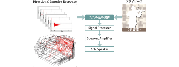 可聴化とは「聴く」ことができるようにする技術のことをいい、コンピュータシミュレーションや模型実験により算出した結果を用いて、ホールの音響設計に活用しています。3次元の立体的な音場を模擬することができる「3次元音場再生システム」を採用し、設計段階における音場の聴感的な評価・確認を行っています。「3次元音場再生システム」とは、無響室内に配置された複数のスピーカーから再生するシステムであり、空間の拡がりや音源の移動などの空間的な印象を3次元的に再現することのできる多チャンネル再生システムの一つです。