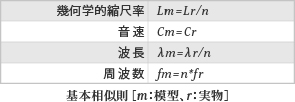 1/n縮尺の模型実験では、実物に対して音速は一定で、距離(=波長)がn倍となることより、音速・波長・周波数の関係より、実験周波数はn倍となります。室内音響の模型実験では、最も一般的に用いられている1/10縮尺を採用しています。
