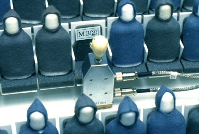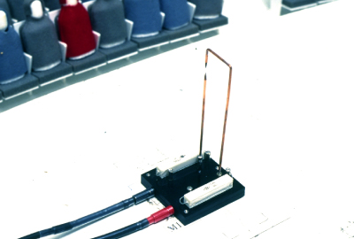 実物ホールの測定では、12面体無指向性スピーカや人の頭を模擬したダミーヘッド等を使用するのに対して、模型実験では上記の基本相似則より放電パルスを音源に用います。放電パルス音源は、可聴帯域をはるかに越えた100kHz近くの音を含み、無指向性で再現性が良いという特徴があります。また受音マイクには高い周波数まで収音可能な1/4"マイクや、耳の位置に1/6"マイクを埋め込んだ模型ダミーヘッドを使用します。