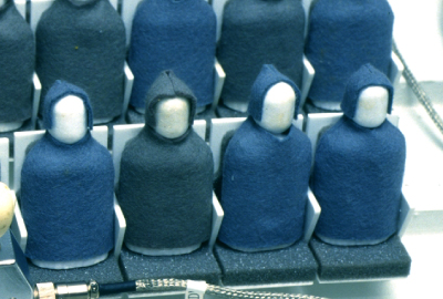 室内の響きは内装材料の吸音特性に大きく左右されます。そのため模型の主要材料については、模型残響室を用いて10倍の周波数で実物と同等の吸音特性となることを確認して選びます。とくに椅子と人体は受音点に近いため、吸音特性や形状をできるだけ実物に合わせる必要があります。人体模型は、ポリスチレンフォームに服と髪の部分にフェルト厚さ1mmを被覆し、低音域の吸音のため腹部に空洞をあけたもので、全帯域に渡って実物椅子の着席時の吸音率に非常に近い値となっています。