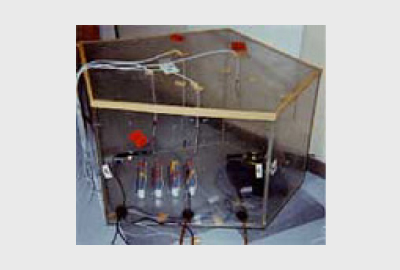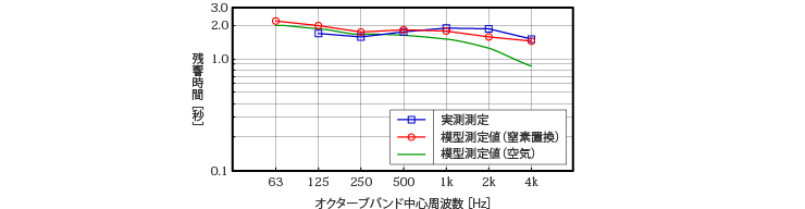 模型実験では高周波数の音を用いるため、空気による音響吸収の影響が無視できなくなり、高域のエネルギーが早く減衰し残響が短くなります。この影響を取り除く方法として、減衰に寄与する酸素分子を除去する窒素置換法を用います。実験では、通常21%前後の酸素濃度を極めて低い5%以下の濃度にして行います。